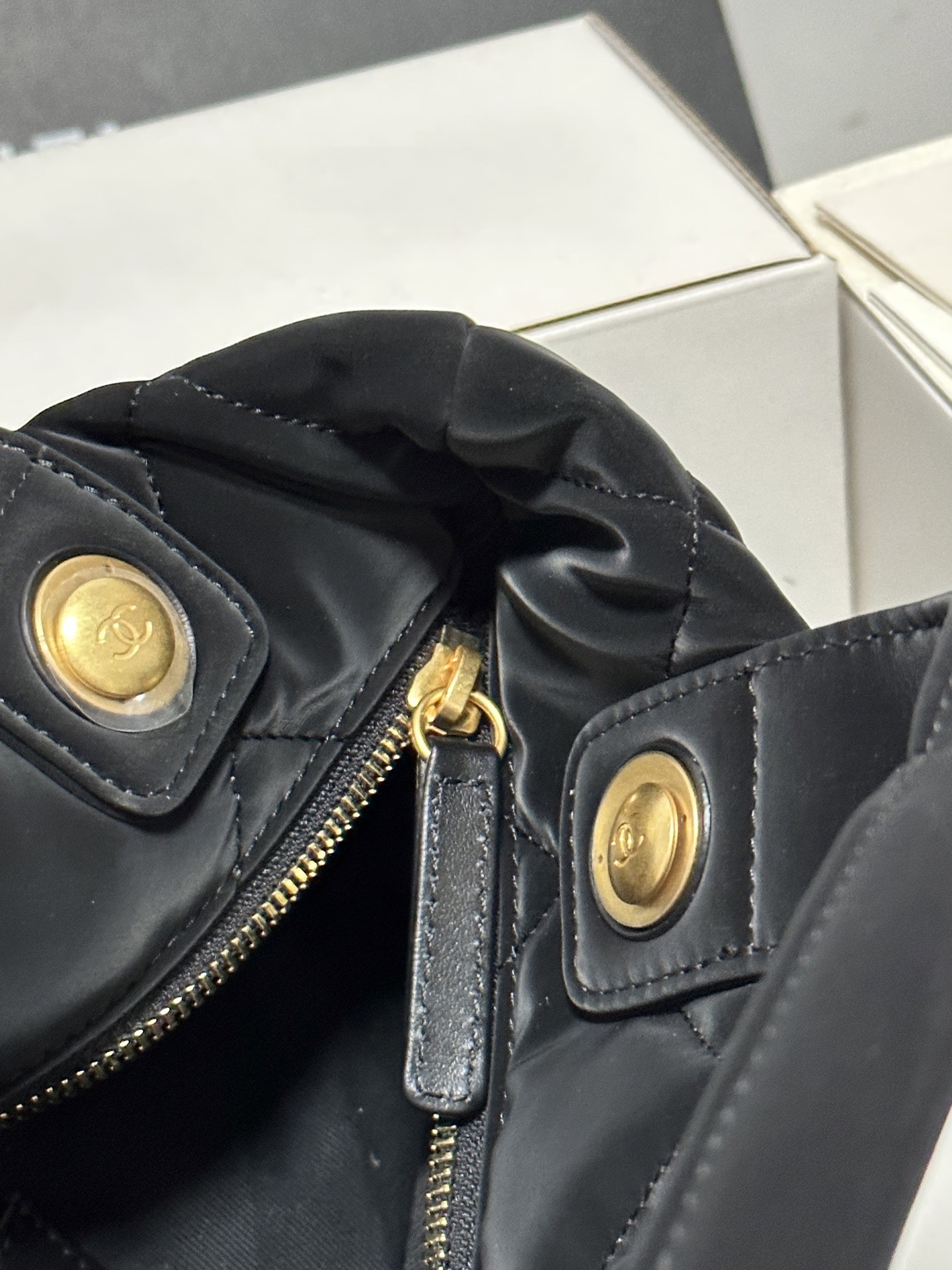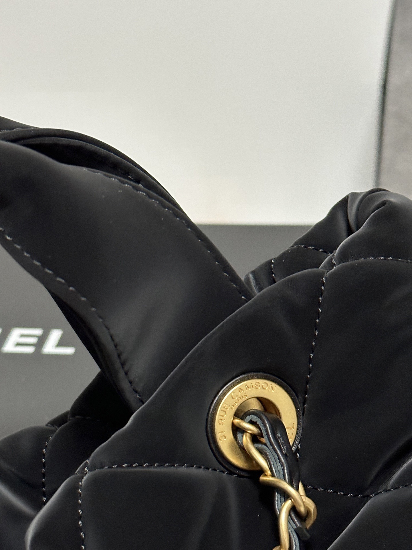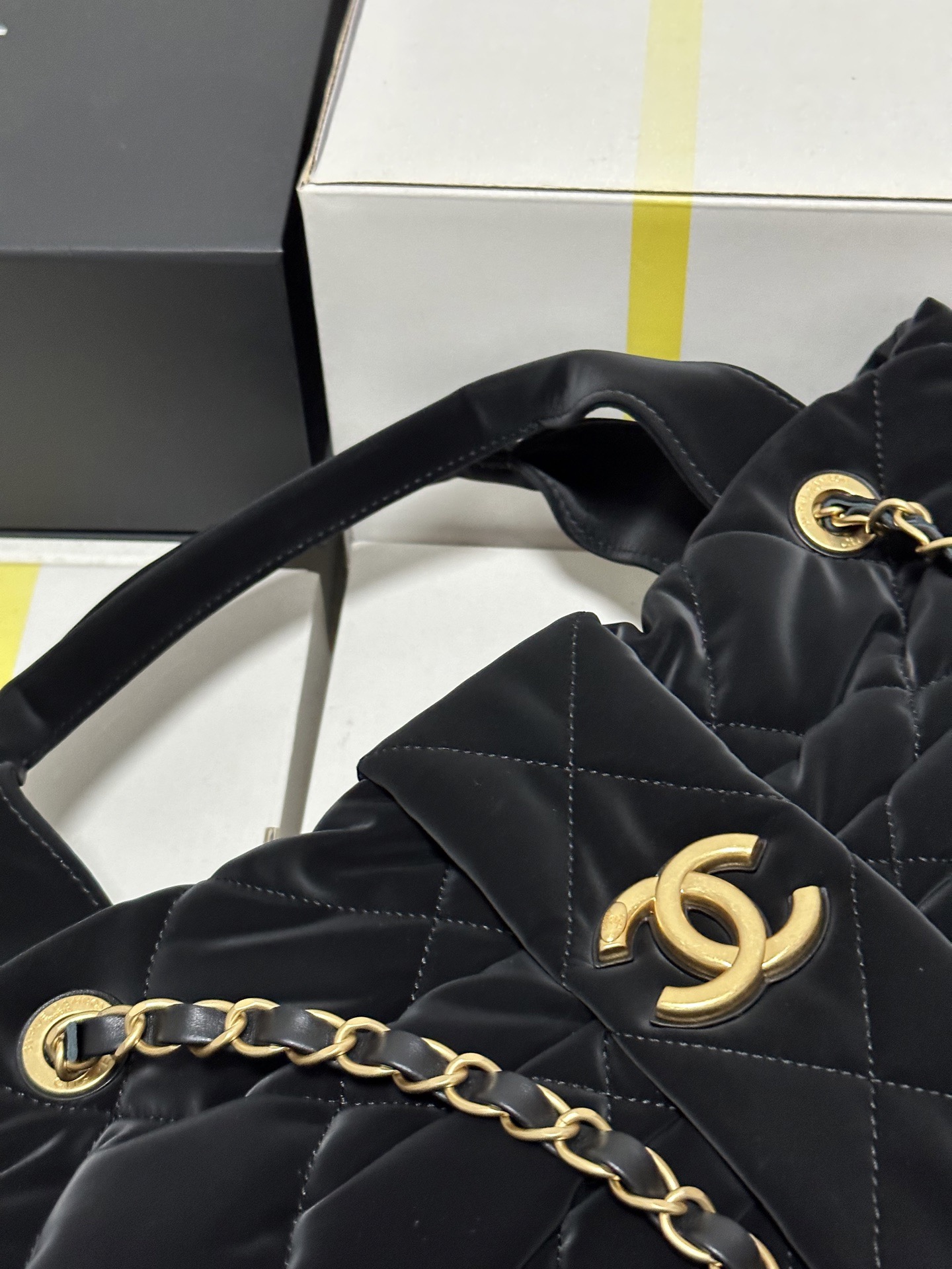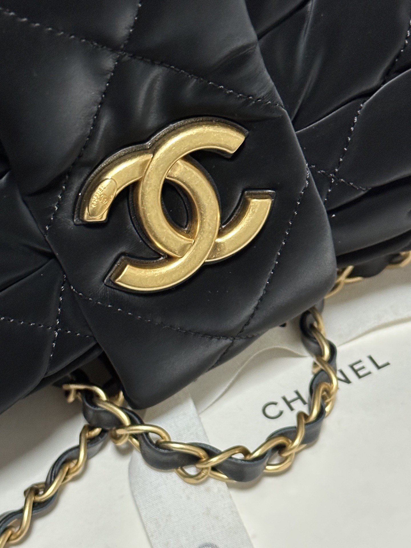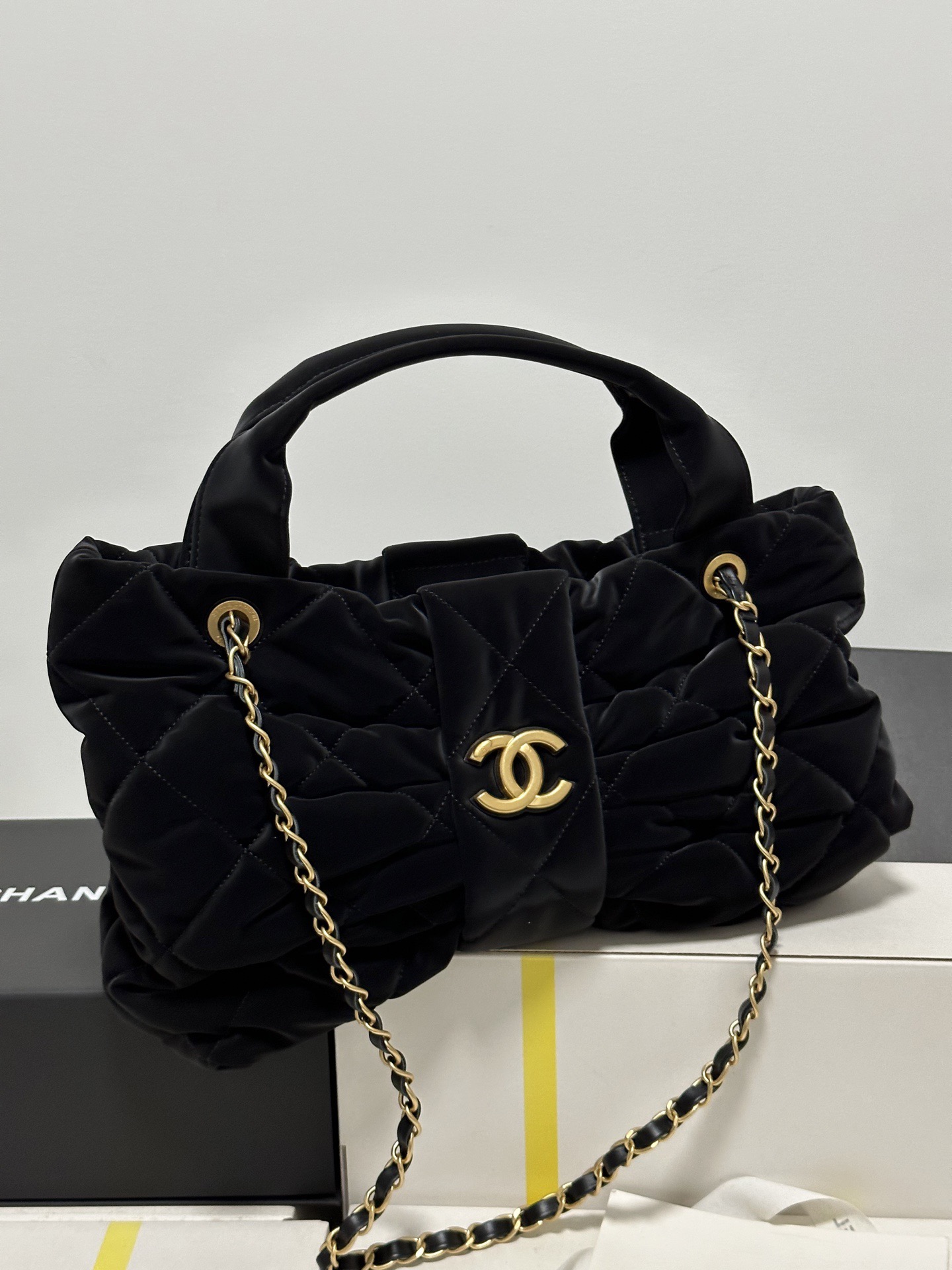 CHANEL 25K bow design with golden logo washed denim single-shoulder handbag, black for women