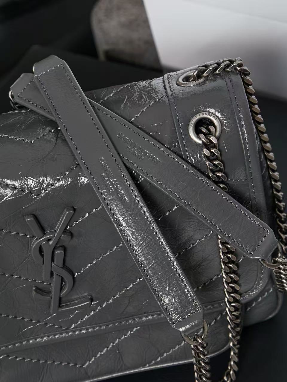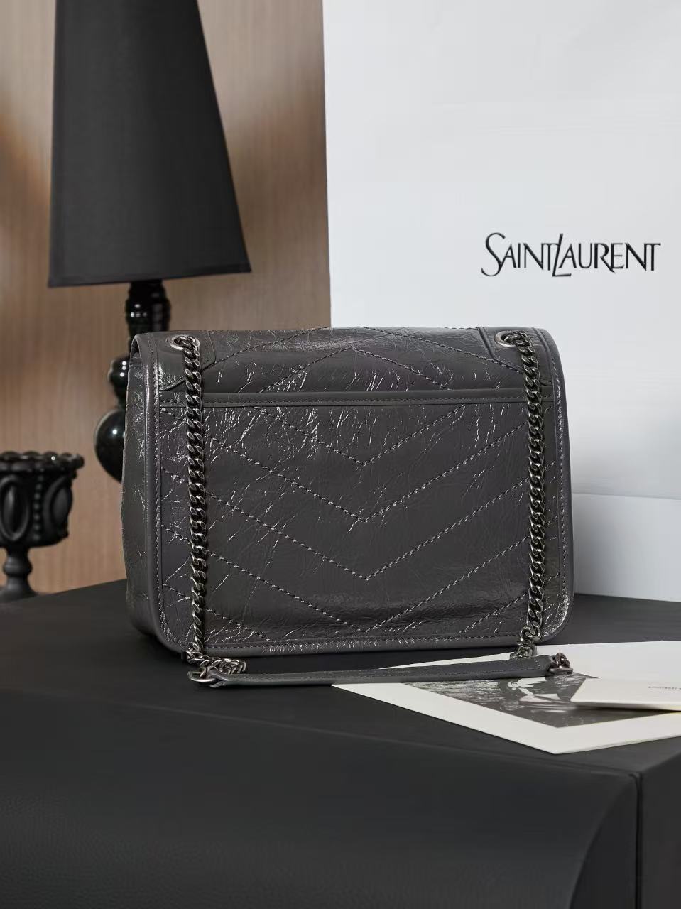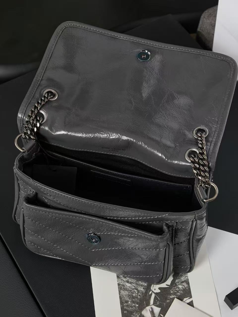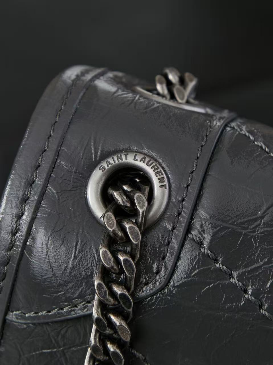 SAINT LAURENT YSL Niki Logo chain retro pleated wandering bag crossbody single-shoulder bag medium-sized women\'s grey