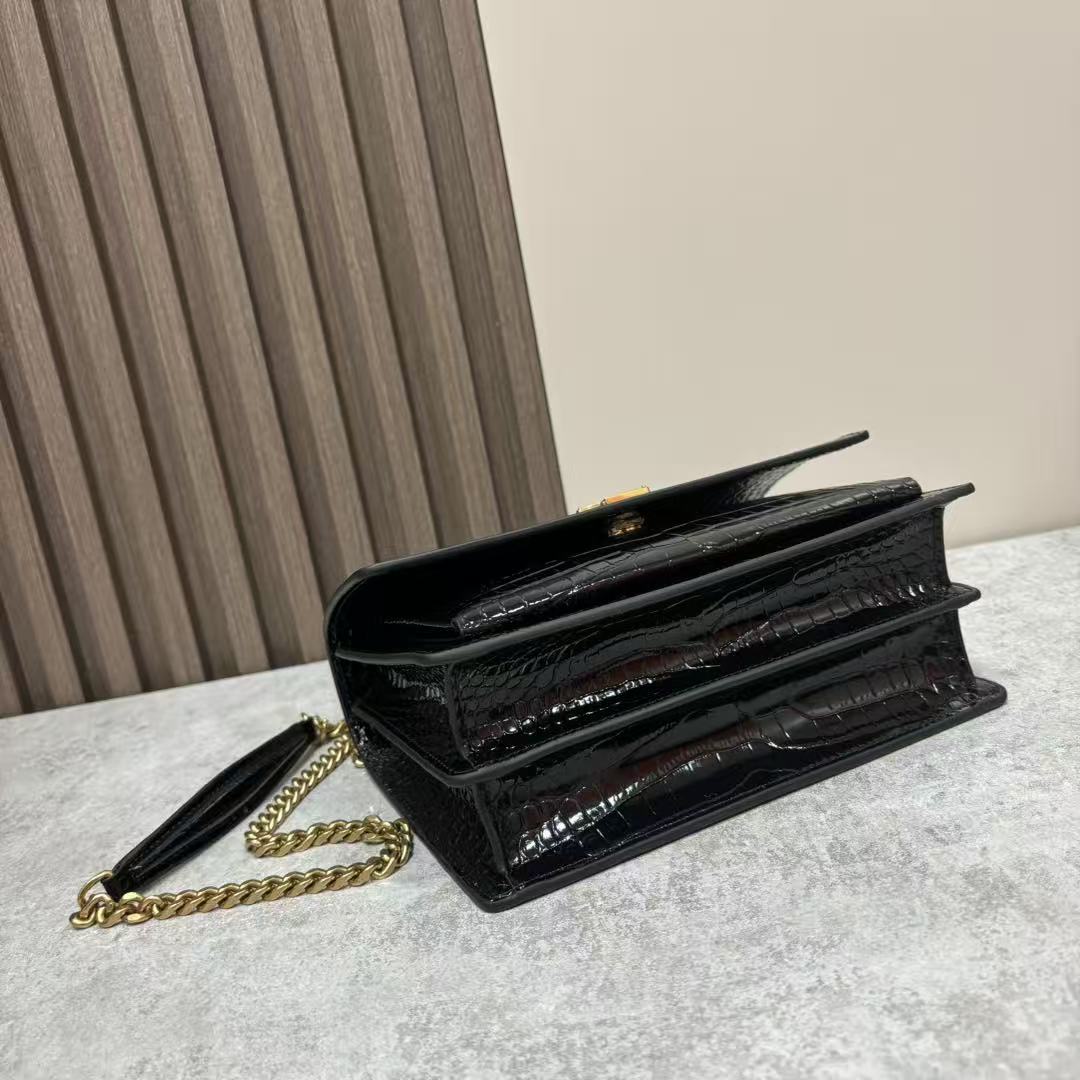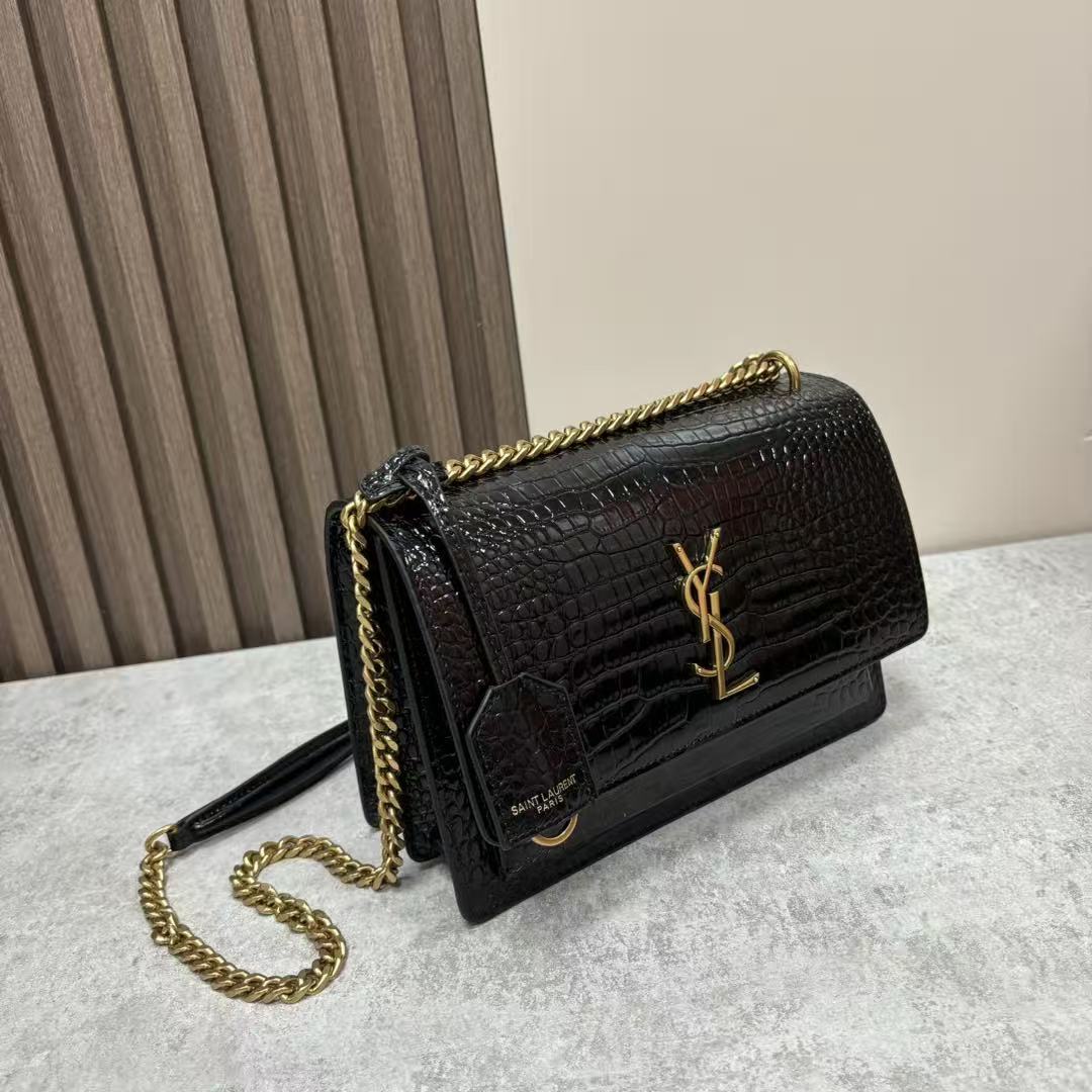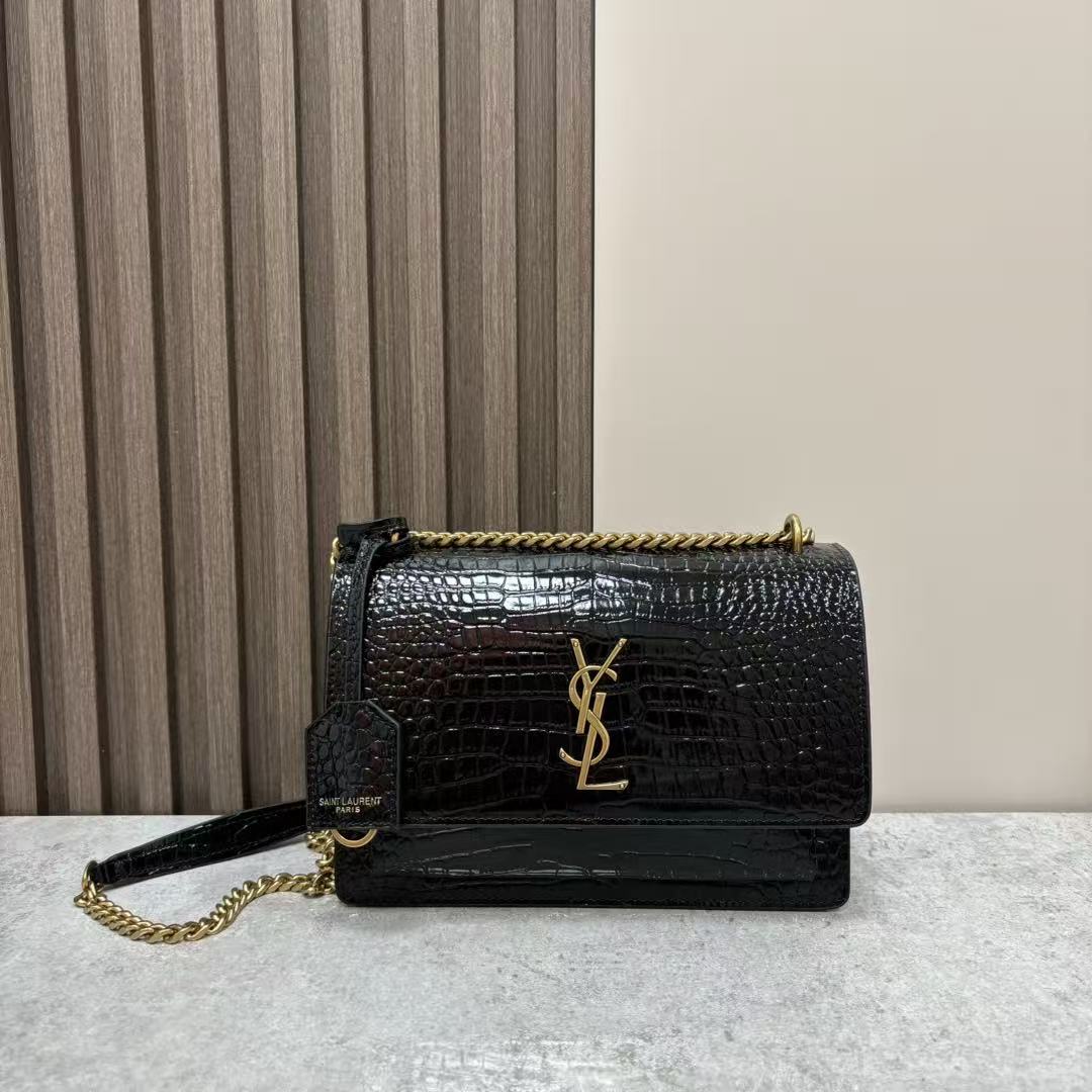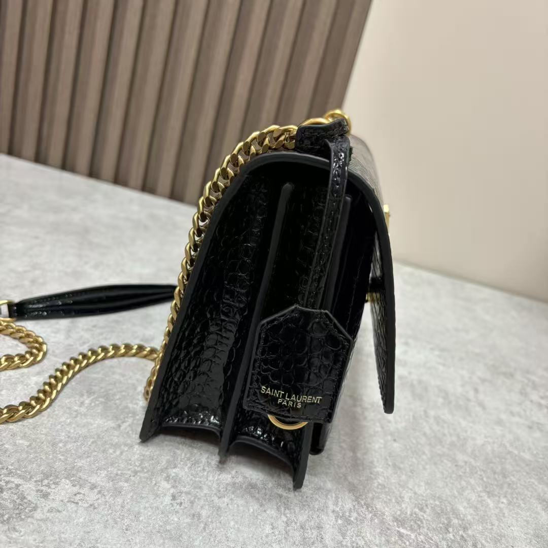 SAINT LAURENT YSL SUNSET bag, distressed gold Logo chain crossbody single-shoulder bag, medium size for women, black