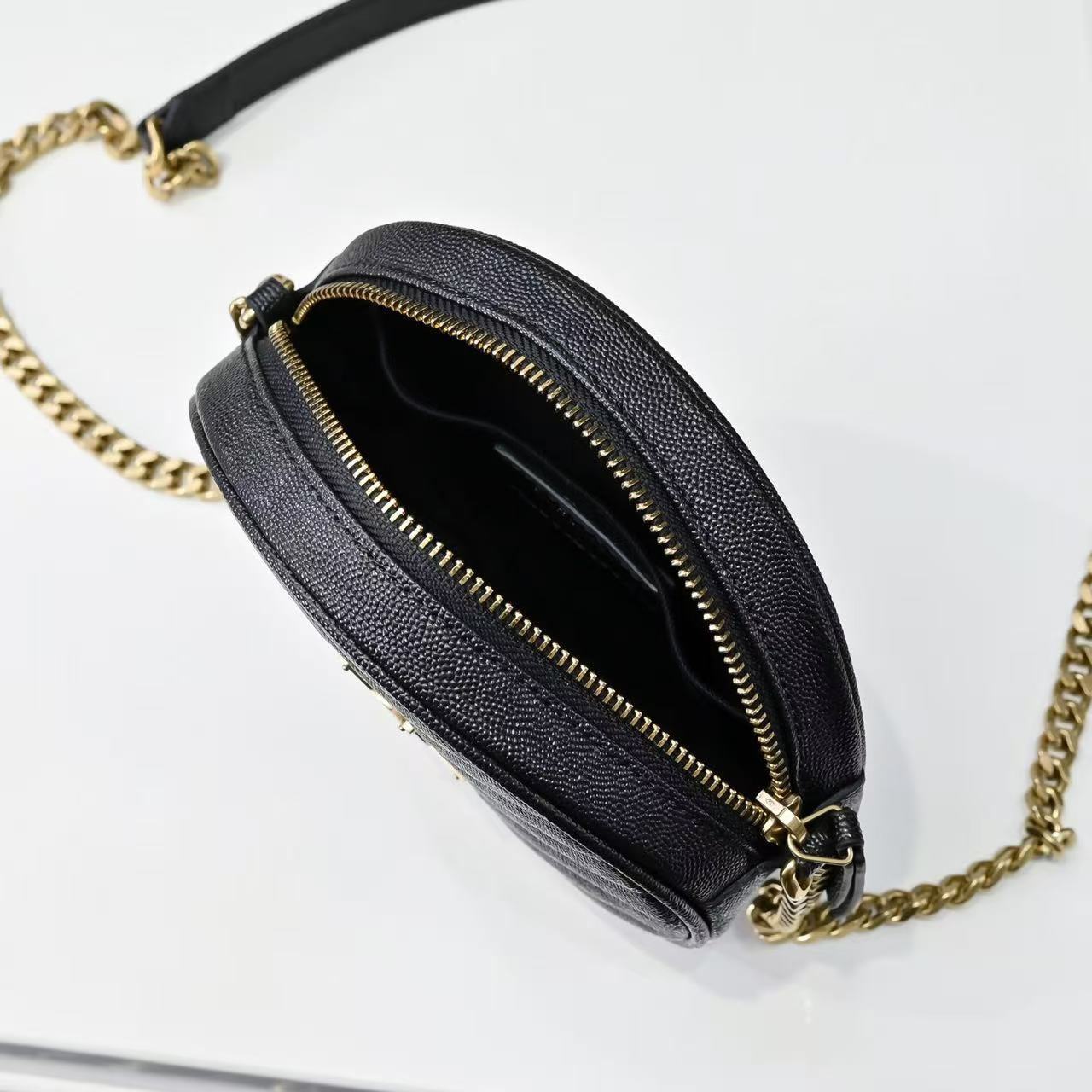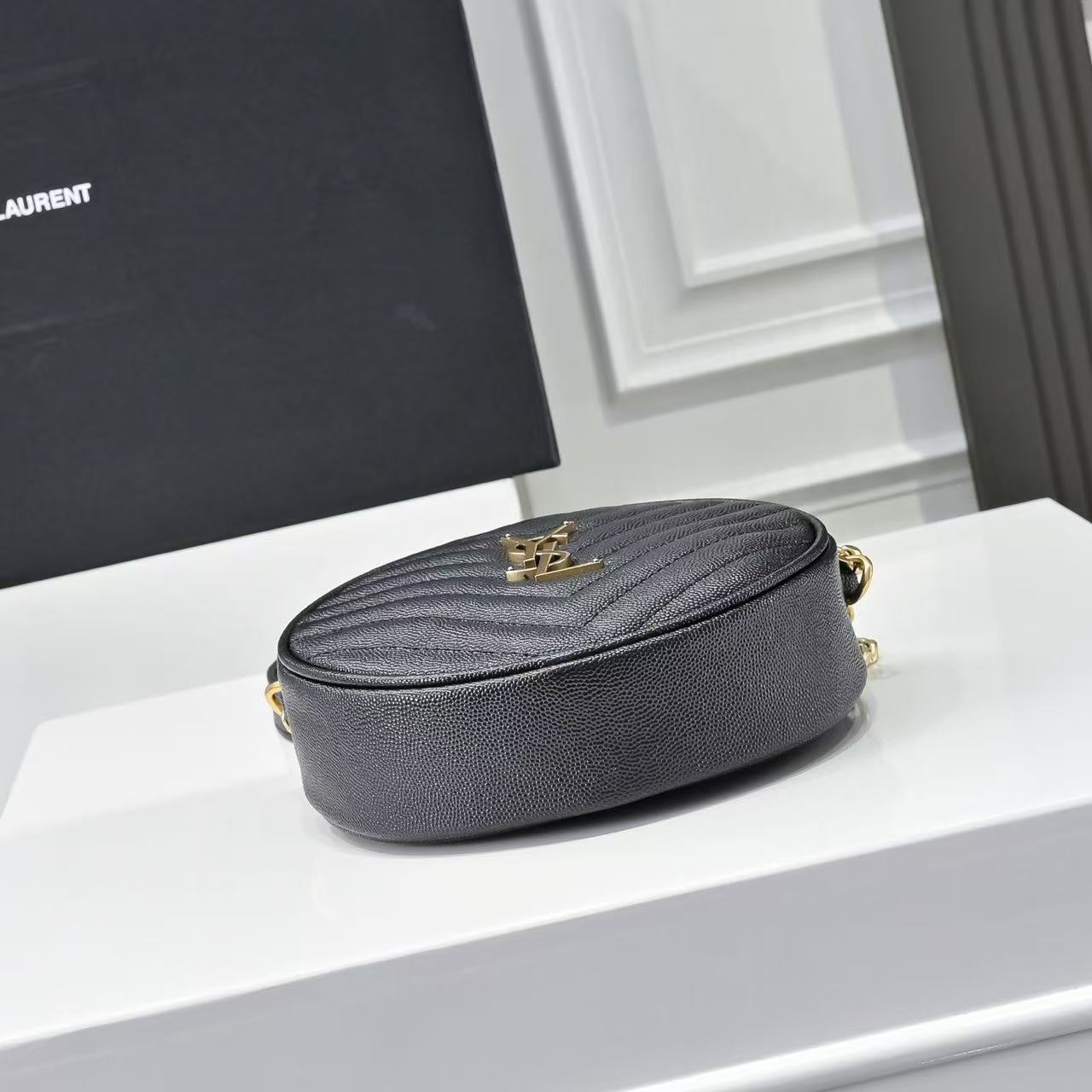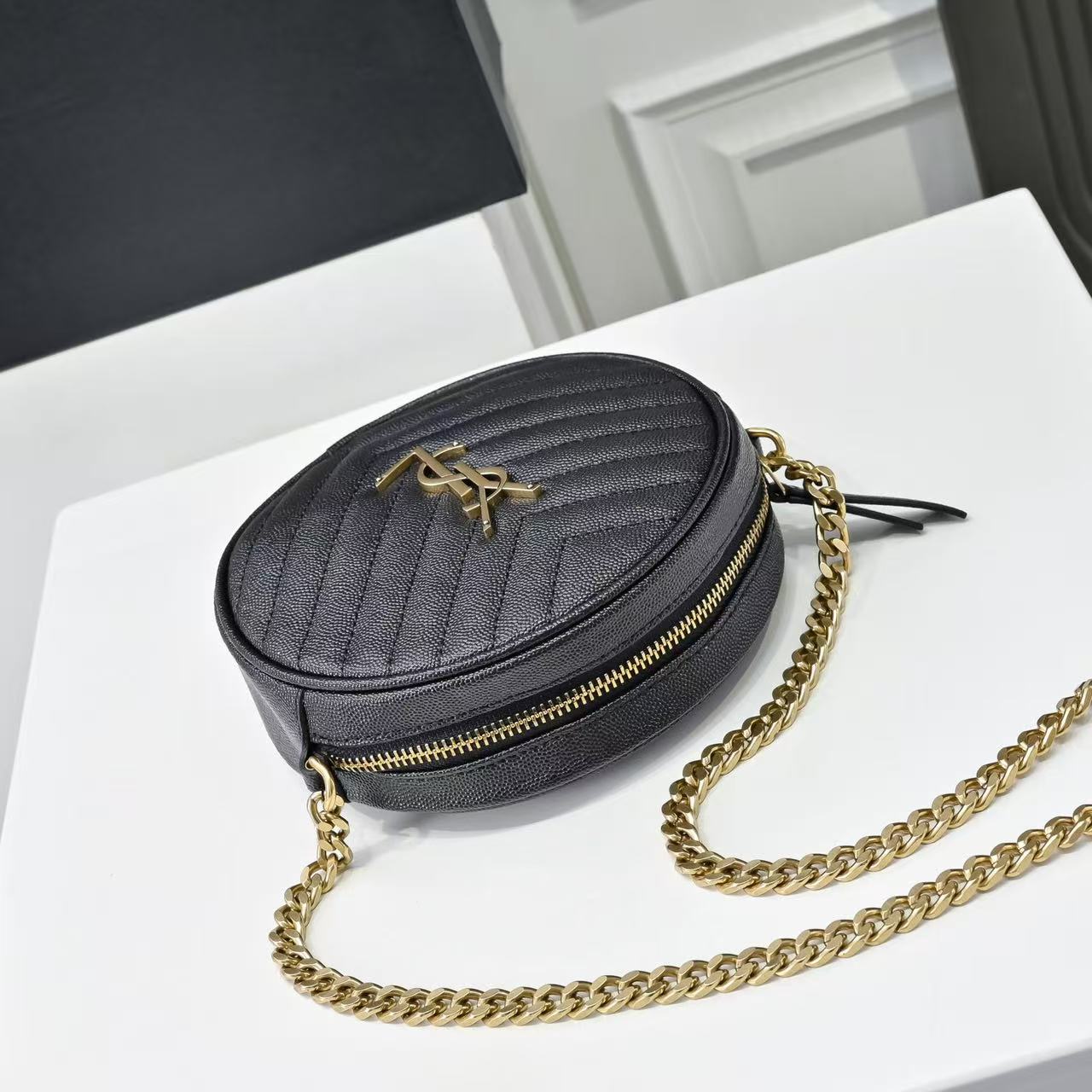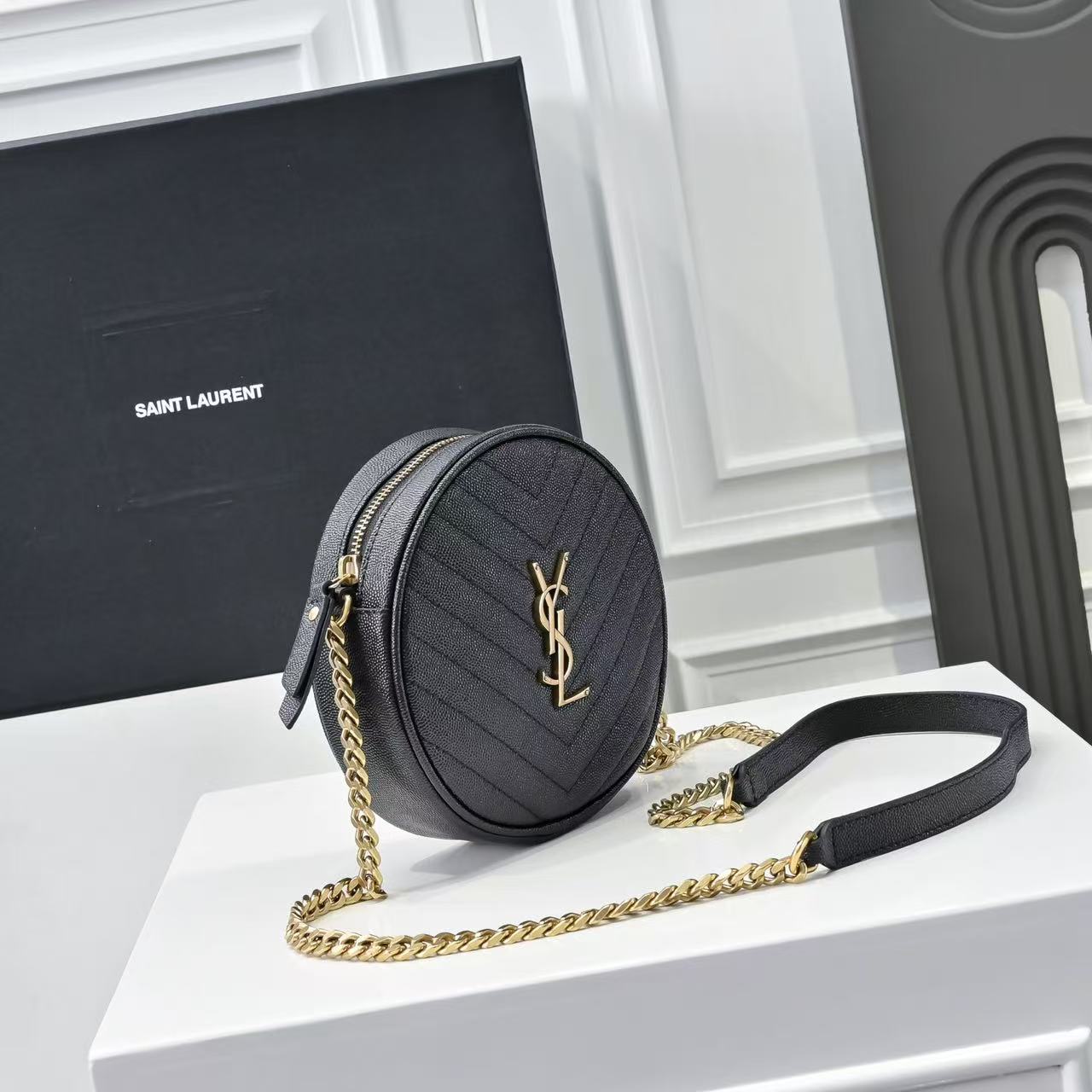 SAINT LAURENT YSL Vinyle distressed gold Logo chain quilted small round bag crossbody single-shoulder bag for women, black