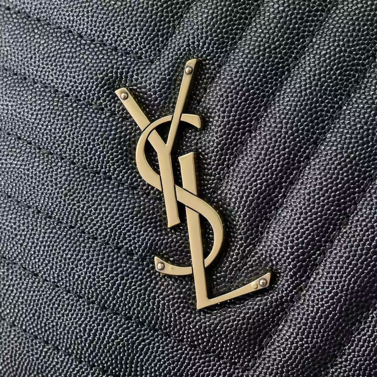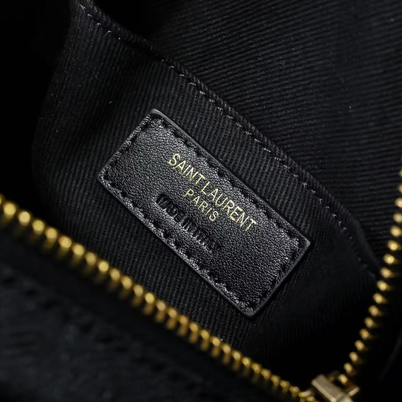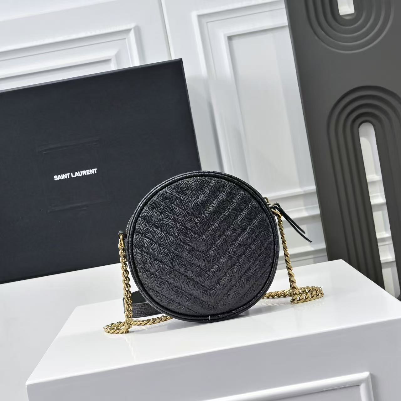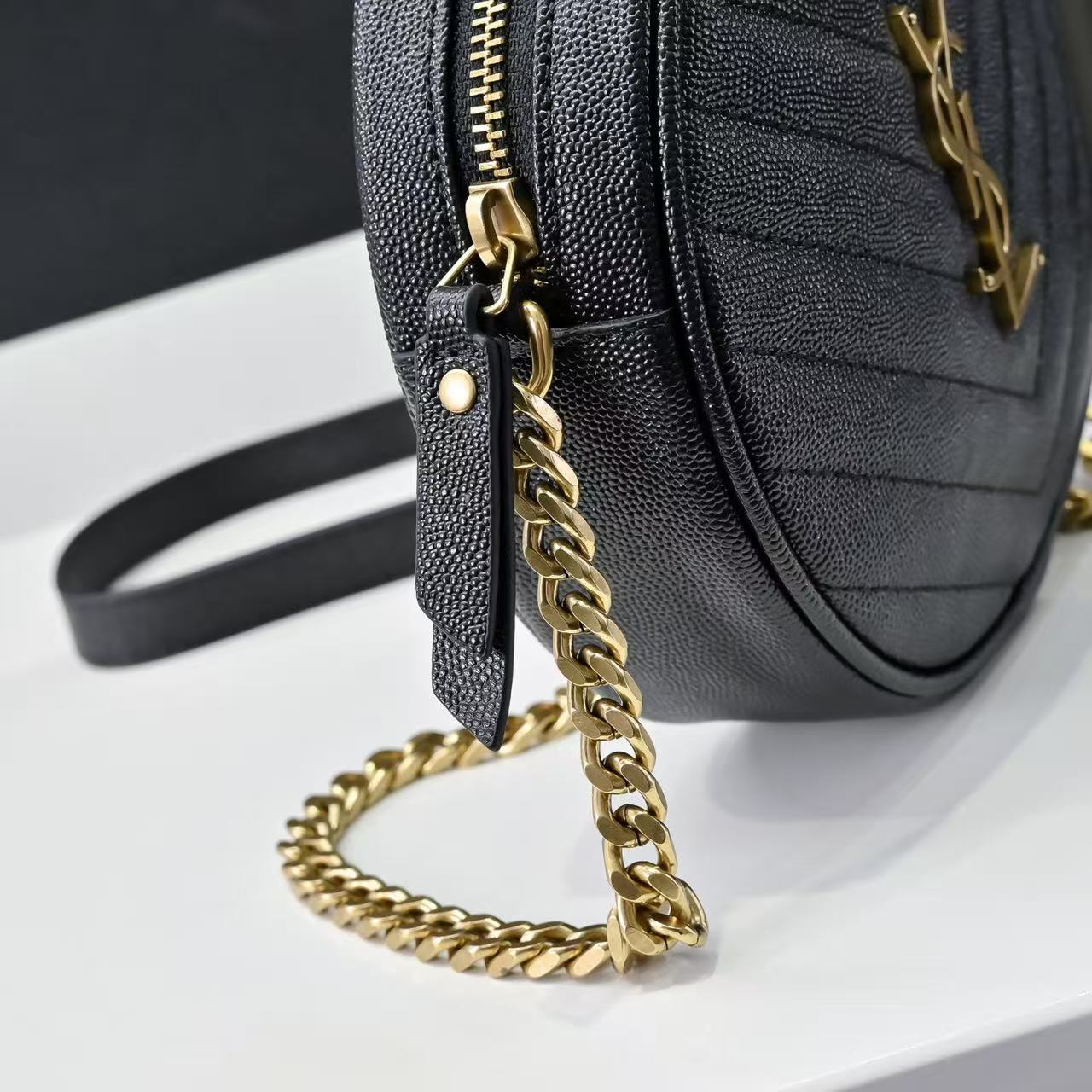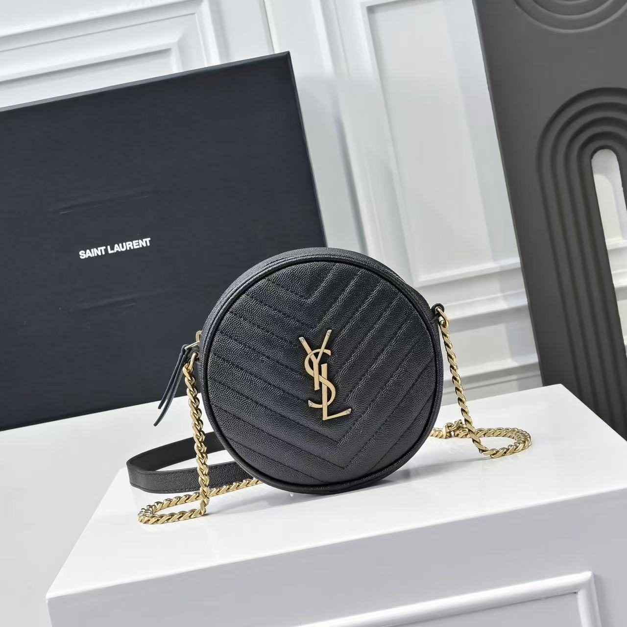 SAINT LAURENT YSL Vinyle distressed gold Logo chain quilted small round bag crossbody single-shoulder bag for women, black